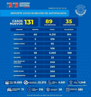 131 CASOS DE COVID-19 SE REGISTRARON EN LA REGIÓN DE ANTOFAGASTA HOY 25 DE JULIO