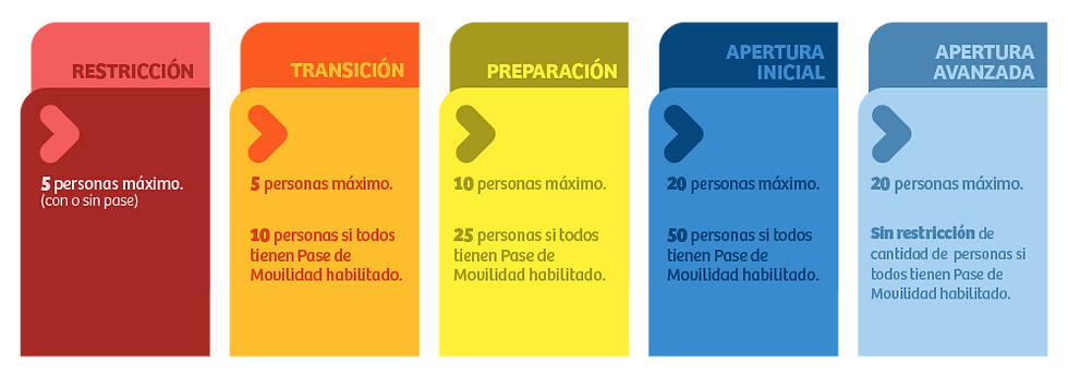 Principales cambios en aforos y en la operación de actividades. En todos los pasos se podrá realizar cualquier tipo de actividad, pero con aforos y condiciones más o menos restrictivas dependiendo de la condición sanitaria del lugar. De esta manera, se apunta a reducir las aglomeraciones, sobre todo en espacios cerrados, y se norma de acuerdo al tamaño (m2) u otras características del lugar.