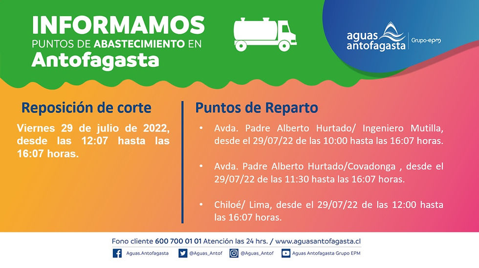 Recordar a toda la comunidad que Aguas Antofagasta tiene a su disposición, la información de este corte en su sitio web, cuenta Twitter oficial @aguas_antof, además del servicio 24/7 de nuestro Fono Cliente 600 700 01 01. Donde pronto se informarán los puntos de abastecimiento de agua potable.