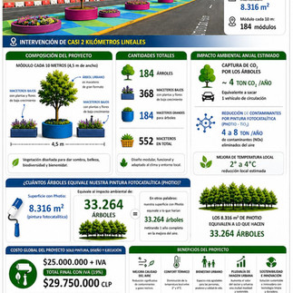 Mientras que, los trabajos que implican una inversión de $29.750.000, consideran también el pintado del bandejón central con la tecnología fotocatalíca (photio) en un área de 8.316 m2, sistema que permite la captura de CO2 y la reducción de contaminantes, mejorando la calidad del aire, reduciendo la temperatura entre 2 y 4 grados, equivalente a 33.264 árboles en total.