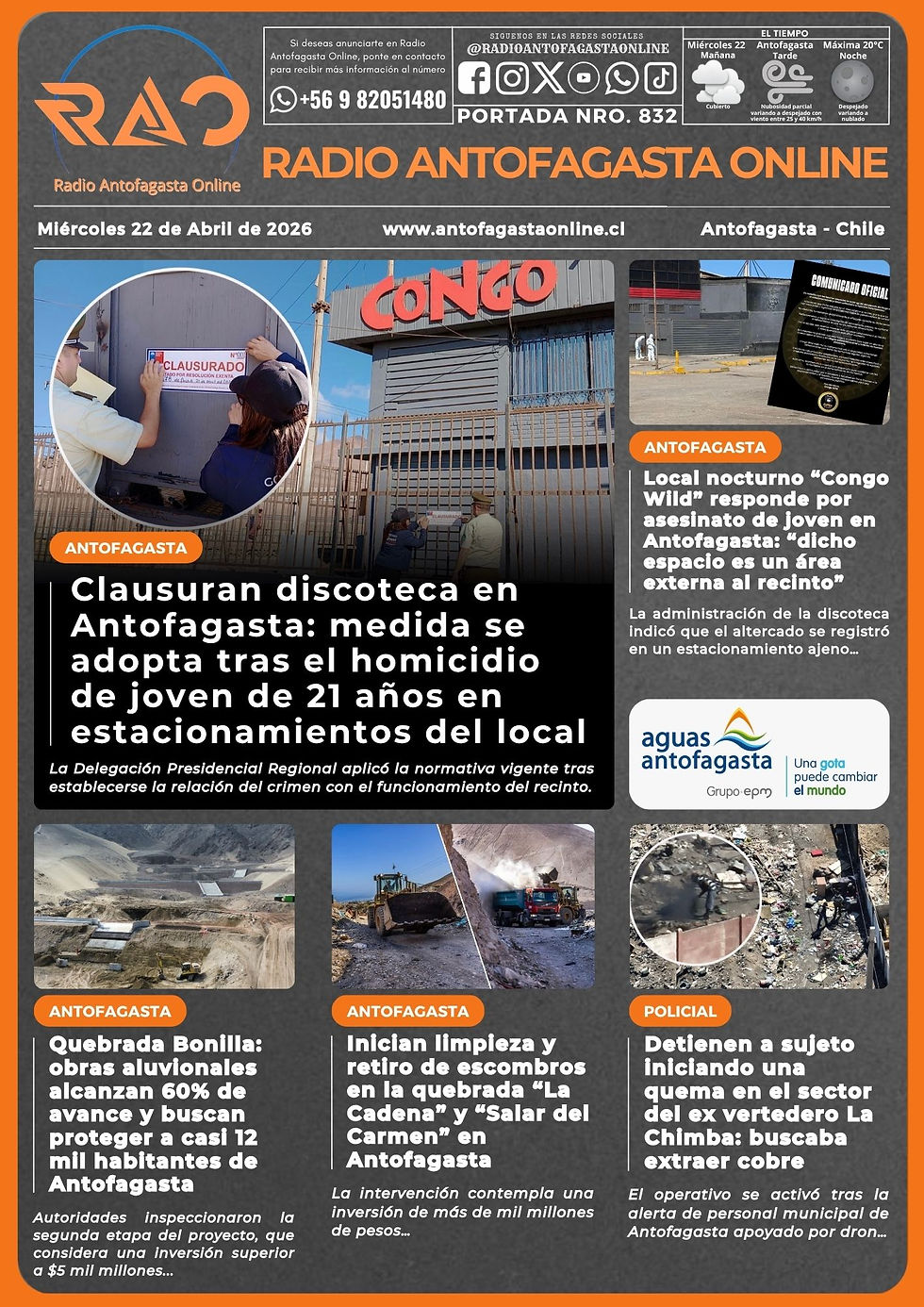 Portada N°832 de Radio Antofagasta Online para hoy miércoles 22 de abril de 2026